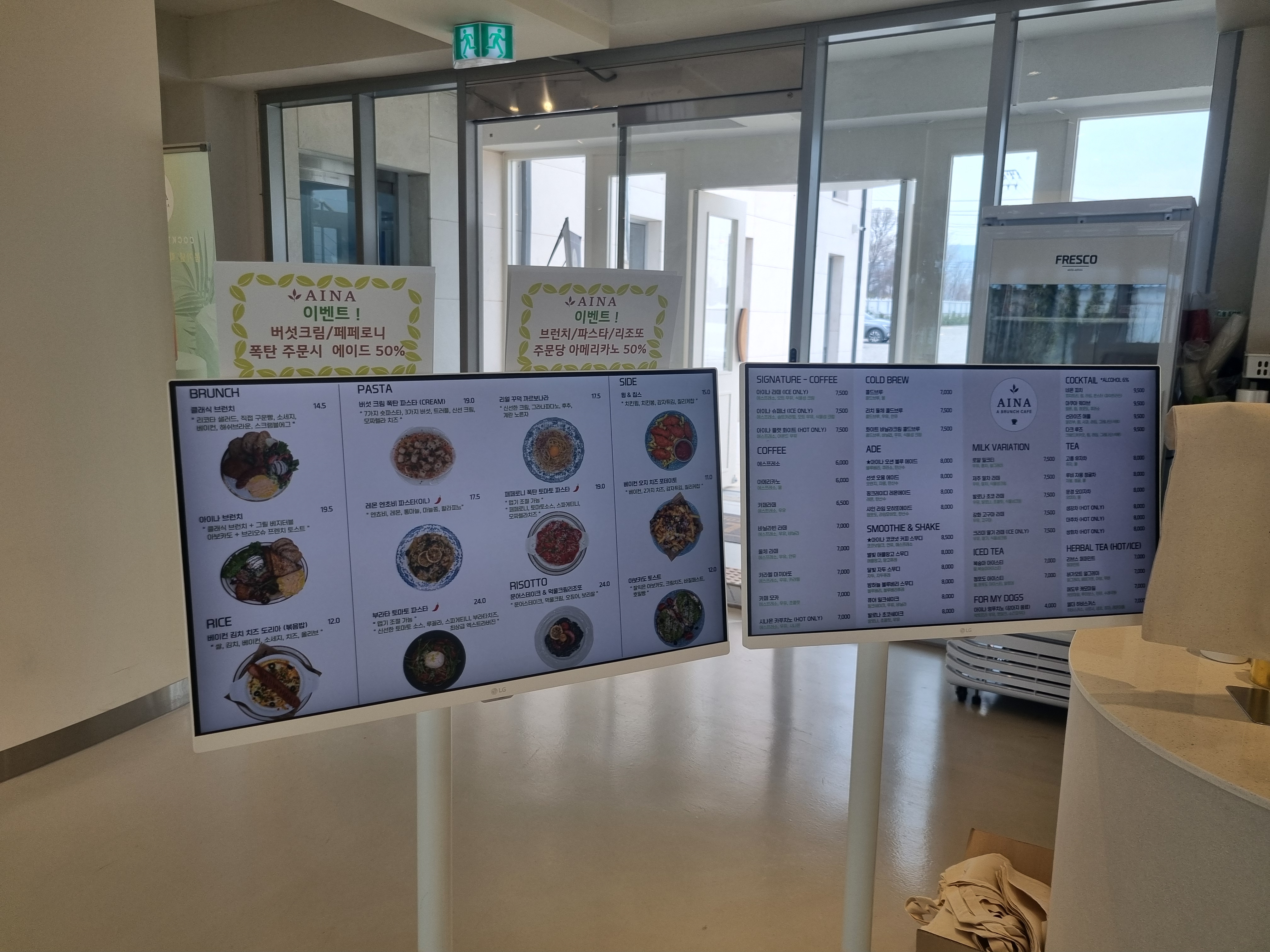 브런치메뉴를 주문하면 커피와 에이드가 50% 입니다.